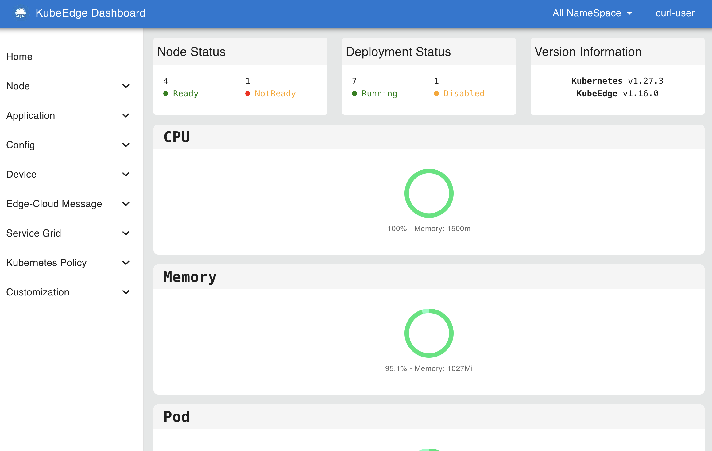 Based on previous Dashboard release, we have refactored the KubeEdge Dashboard using the more popular frameworks Next.js and MUI. In the new release, we rewrote and optimized around 60 pages and components, reducing about 70% of redundant code. We also upgraded the KubeEdge and native Kubernetes APIs to the latest version to maintain compatibility and added TypeScript definitions for the APIs.